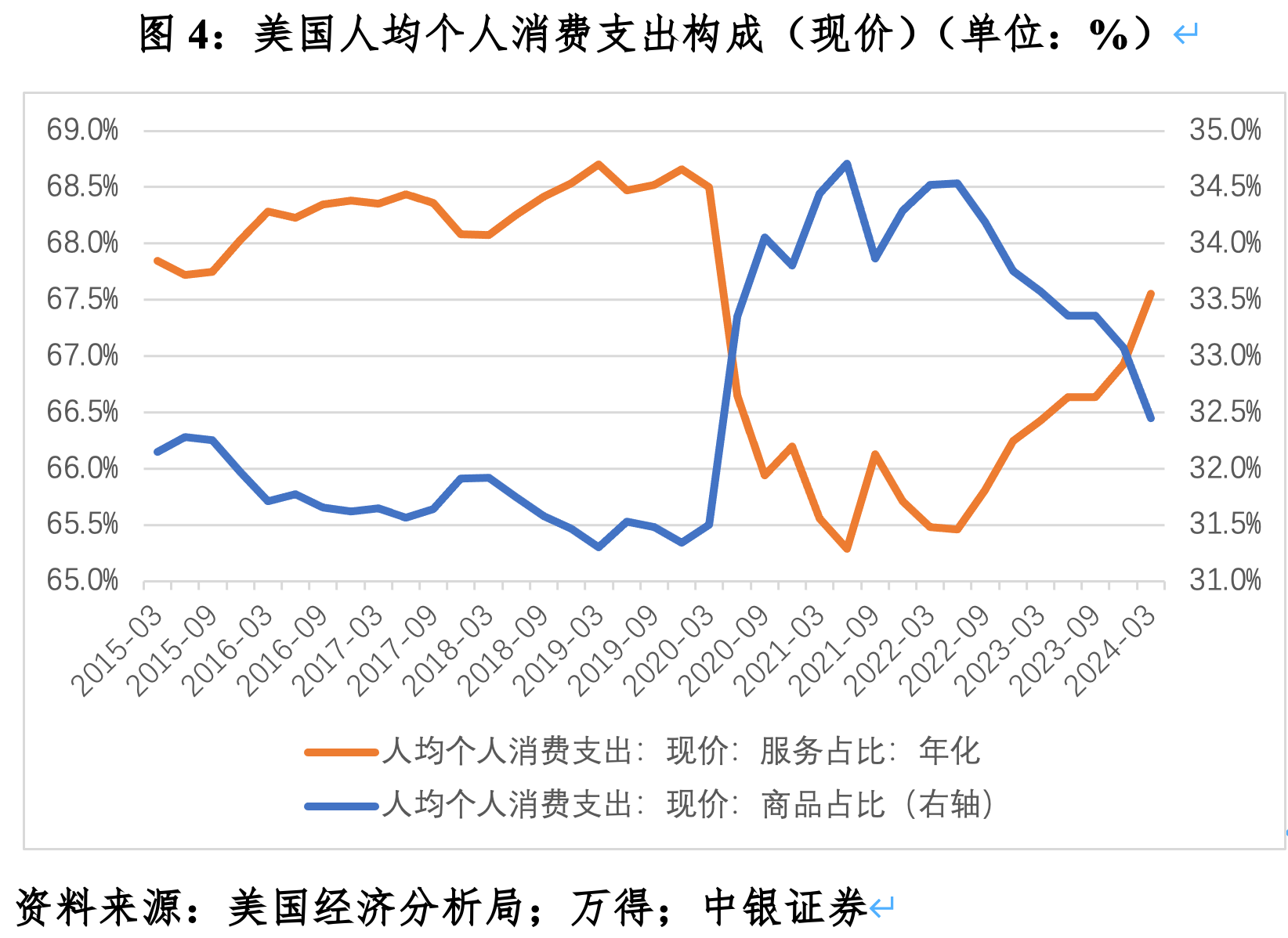 好意思国经济收复仍处于从商品转向服务消费的经由中。疫情大冲击、经济大停摆,导致好意思国经济复苏始于商品消费。到2021年二季度,东谈主均个东谈主消费支拨中,商品支拨占比34.7%,跳跃2015年一季度~2019年四季度季均值(疫情前五年趋势值)3个百分点。而后,跟着疫情解封,东谈主员流动正常化,服务坐褥和消费场景被激活,商品支拨占比缓缓裁汰。到2024年一季度,商品支拨占比32.4%,较2021年二季度高点回落2.4个百分点,但仍跳跃疫情前五年趋势值0.7个百分点。即便2024年一季度,好意思国内容GDP环比折年率增长1.3%,低于市集预期的2.4%,较上季回落2.1个百分点,其中内容个东谈主消费支拨增速环比回落2.4个百分点。但在同期内容商品消费支拨环比折年率下落3.5%,增速较上季回落6.1个百分点的情况下,内容服务消费支拨环比折年率增长2.8%,增速与上季捏平。