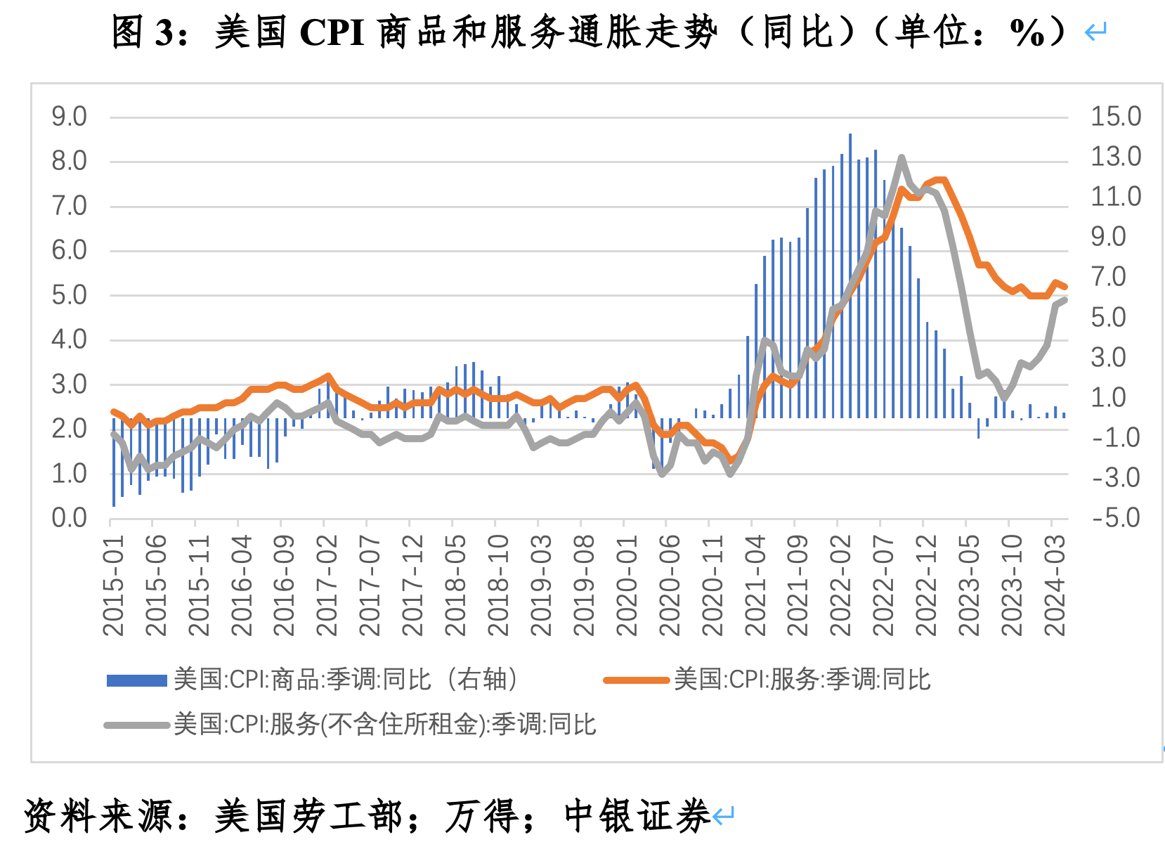 好意思国CPI和PCE通胀齐是在2022年6月见顶,这主要反应了各人供应链的改善和外洋大批商品价钱的回落。自2023年3月起,剔除能源和食物的好意思国CPI和PCE的中枢通胀均捏续高于举座通胀,也反应刻下好意思国通胀黏性主要源于服务通胀。关联词,到2024年4月,好意思国CPI服务通胀同比为5.2%,仍非常于2015年1月~2019年12月月均值(疫情前五年前趋势值)的1.95倍;不含住房房钱的服务通胀同比为4.9%,非常于疫情前五年趋势值的2.52倍,从2023年9月同比2.7%、1.39倍的低位显赫反弹。这反应了资本和需求鼓动的详尽影响。
