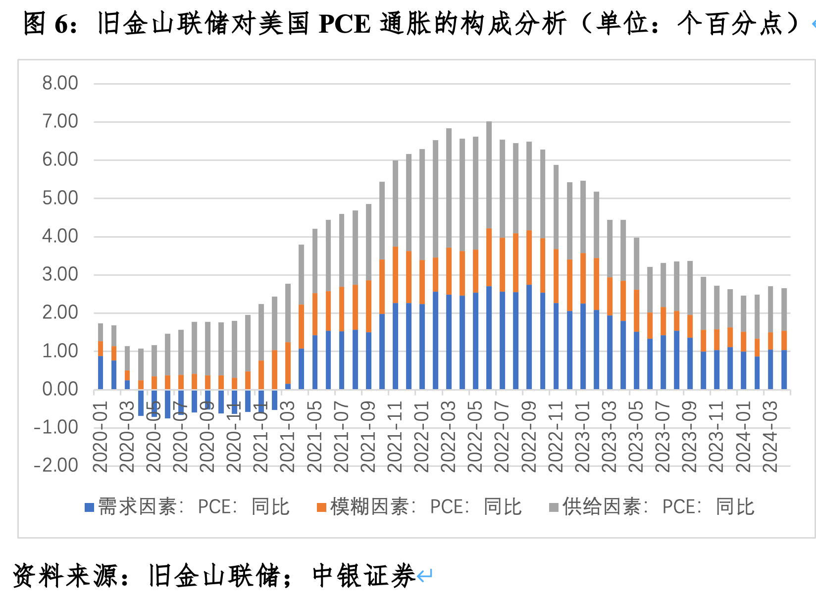 刻下好意思国通胀来自供需两头的冲击雄起雌伏。据旧金山联储测算,2023年,好意思国PCE通胀组成中,需求成分孝顺了40.7%,较2021年上升20.1个百分点;供给成分孝顺了37.6%,回落10.9个百分点。这标明,跟着各人供应链压力缓解,供给成分对通胀的影响消退。关联词,2024年前四个月,需求成分孝顺了38.4%,同比回落3.1个百分点;供给成分孝顺了42.7%,回升8.3个百分点。中枢PCE通胀的最新变化愈加显然:同期,需求成分孝顺了33.0%,同比回落15.9个百分点;供给成分孝顺了48.4%,回升12.0个百分点。
