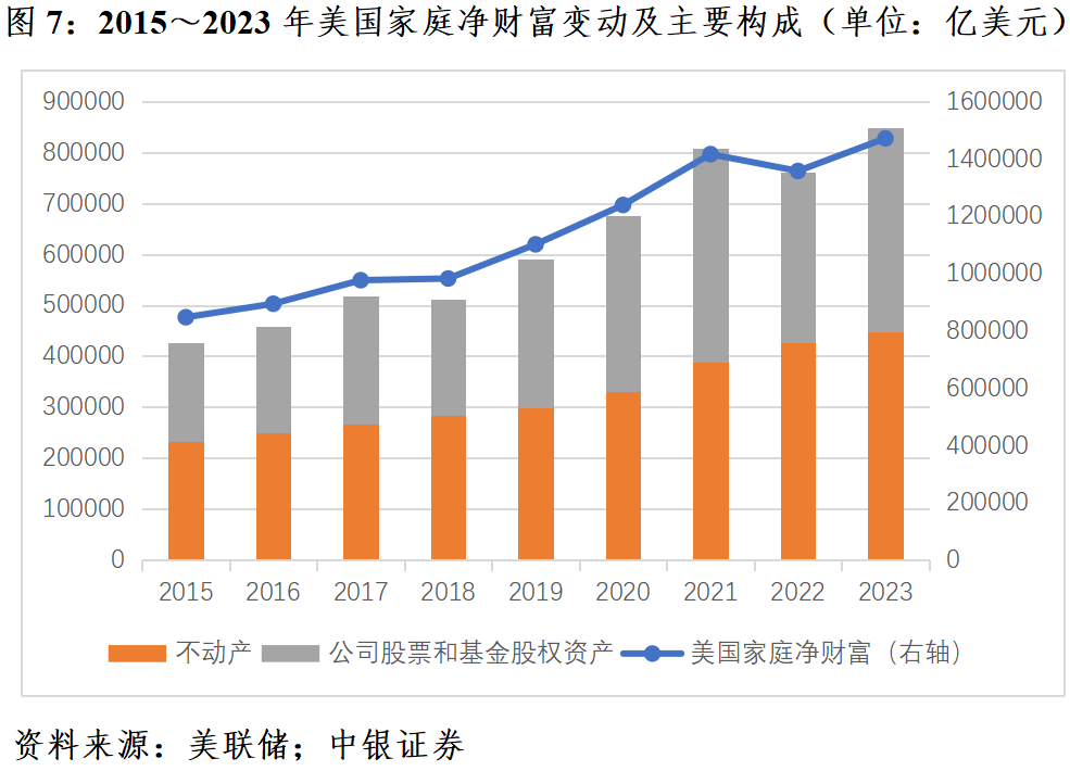其他神志的金钱就包括了股票和房地产价钱高涨带来的正金钱效应。连年来,这方面对个东谈主消费支拨的刺激作用窒碍小觑。凭证好意思联储的散布式金融账户数据,2020~2023年,好意思国度庭净金钱加多了36.98万亿好意思元,其中,不动产捏有加多14.96万亿好意思元,公司股票和基金捏有加多10.74万亿好意思元。而疫情前四年(2016~2019年),前述三项仅阔别加多25.44万亿、6.71万亿和9.82万亿好意思元。