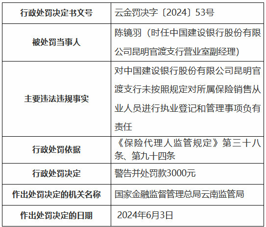 6月19日金融一线音讯,国度金融监督科罚总局云南监管局行政处罚信息公开表融会,中国成立银行股份有限公司昆明官渡支行因未按照功令对所属保障销售从业东说念主员进行握业登记和科罚,受到警告并被罚金3000元。